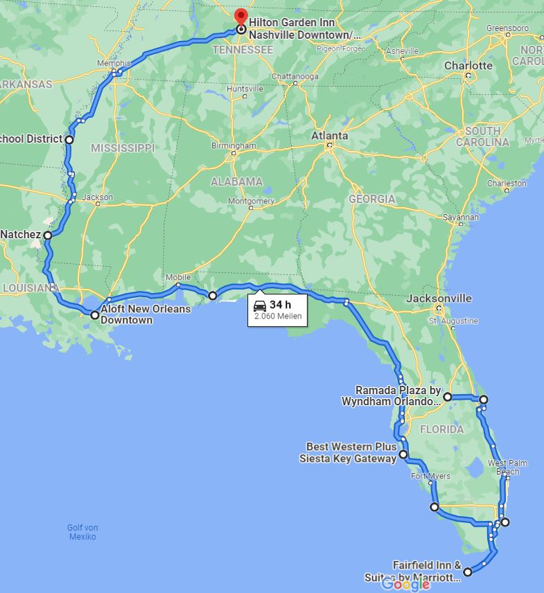 Ich habe 2022 eine Florida Rundreise gemacht, von Orlando über Miami, Key West, New Orleans den Mississippi rauf bis Nashville. 🙂